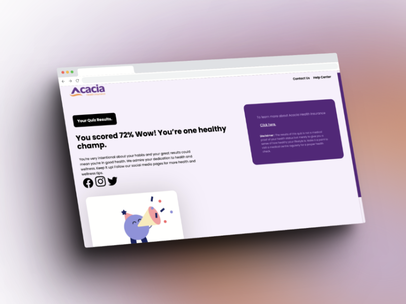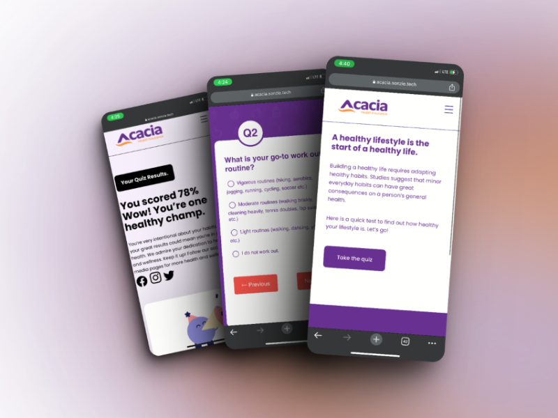 Acacia asserts that cultivating a wholesome life necessitates the adoption of healthy habits. I am fortunate to have contributed to a project with the primary objective of engaging users in health-related quizzes and furnishing them with essential advice and recommendations to foster a healthy lifestyle. Furthermore, the client has expressed a need for an administrative dashboard, enabling them to effortlessly comprehend the data collected through graphical representations. Within this Admin Dashboard, the client possesses the capability to seamlessly incorporate, modify, or remove quiz questions and answer-options. I have meticulously engineered the system to uphold its scoring integrity, even in the face of the myriad adjustments and revisions that an administrator might introduce to the quiz content.